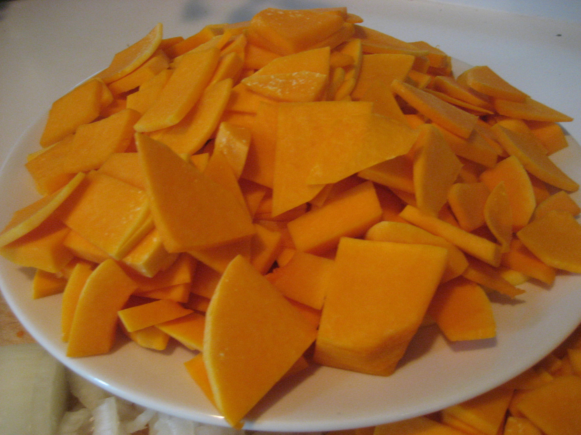 *A food processor fitted with the slicing blade makes short work of the task.  Cut the squash and potato into large chunks and feed into the food processor for slicing.