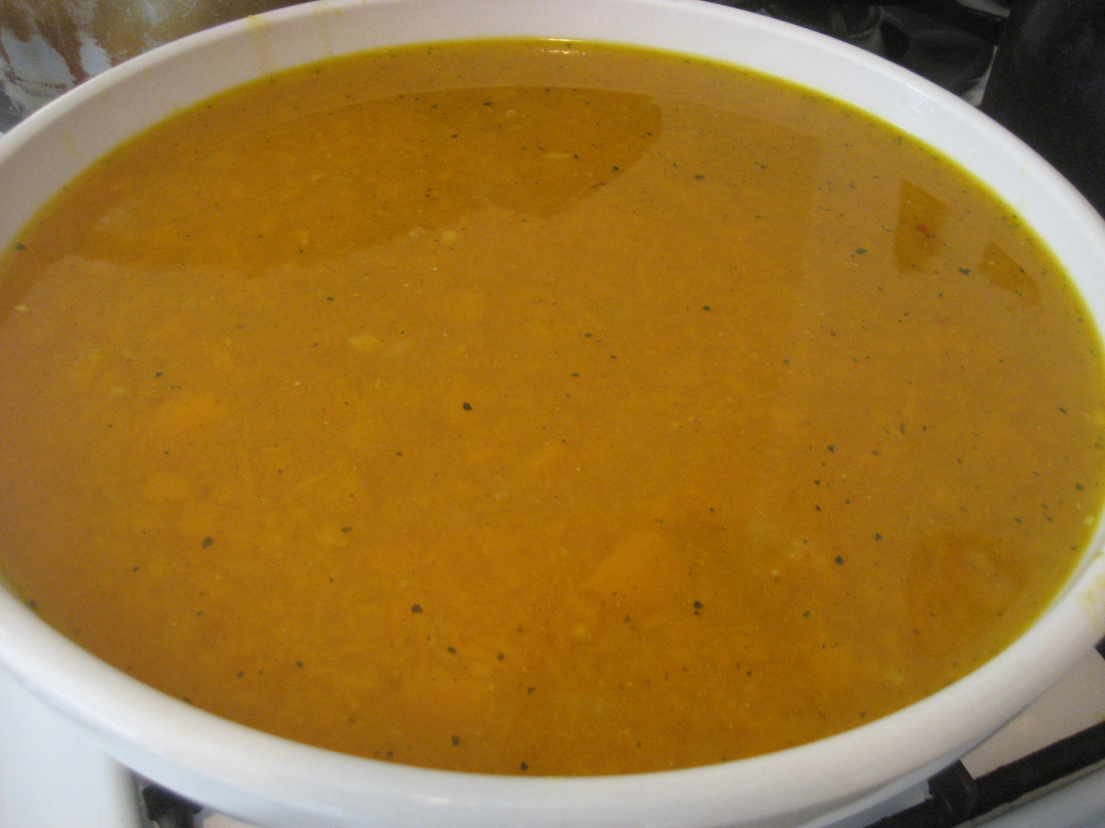 Add the vegetable broth and bring to a boil, continuing to stir occasionally. Lower the heat, partially cover, and cook until the squash is very tender, about 20 minutes. Use a potato masher as the soup is cooking to break up the vegetables.