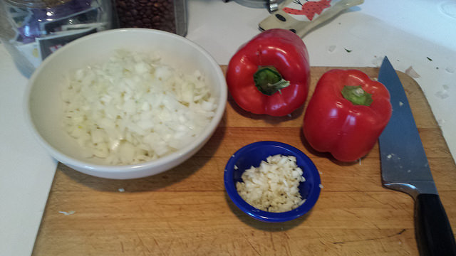 In the same frying pan, without adding additional oil, add the red pepper strips, saute until softened and set aside.