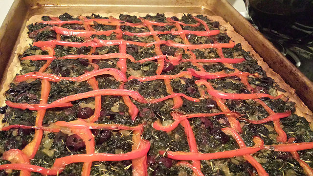 Stir the olives into the spinach mixture. Then spread the spinach mixture evenly over the dough, leaving about a 1/2 inch border.