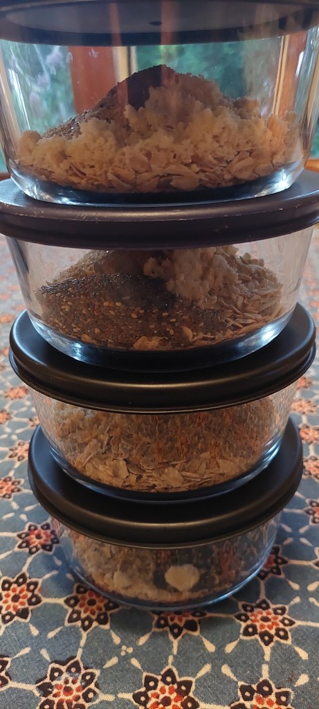 I have four 2-cup size glass covered bowls for overnight oats. It saves time to assemble the dry ingredients for all four bowls at once. To each bowl, add the following. Then cover and set aside until the night before you’d like oats for breakfast.