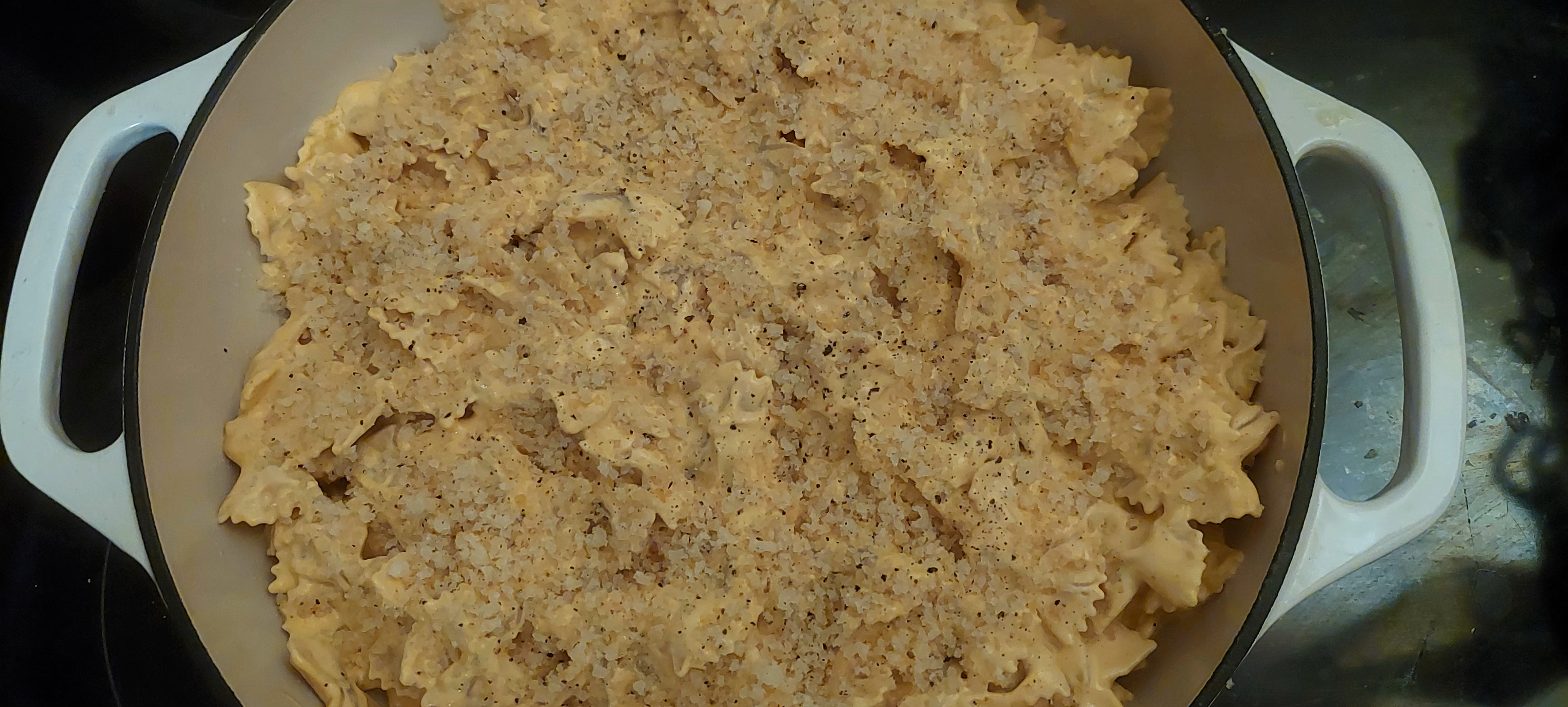 Put the baking pan you’ll be using for the mac & cheese on the stove over medium heat. We used a cast iron enameled casserole with lid. Once warm, add the butter and let it melt. Add the bread crumbs and season well with salt and pepper. Stir and toast until golden. Then, scrape the crumbs into a small bowl and set aside. Leave the pan to cool (no need to wash it).